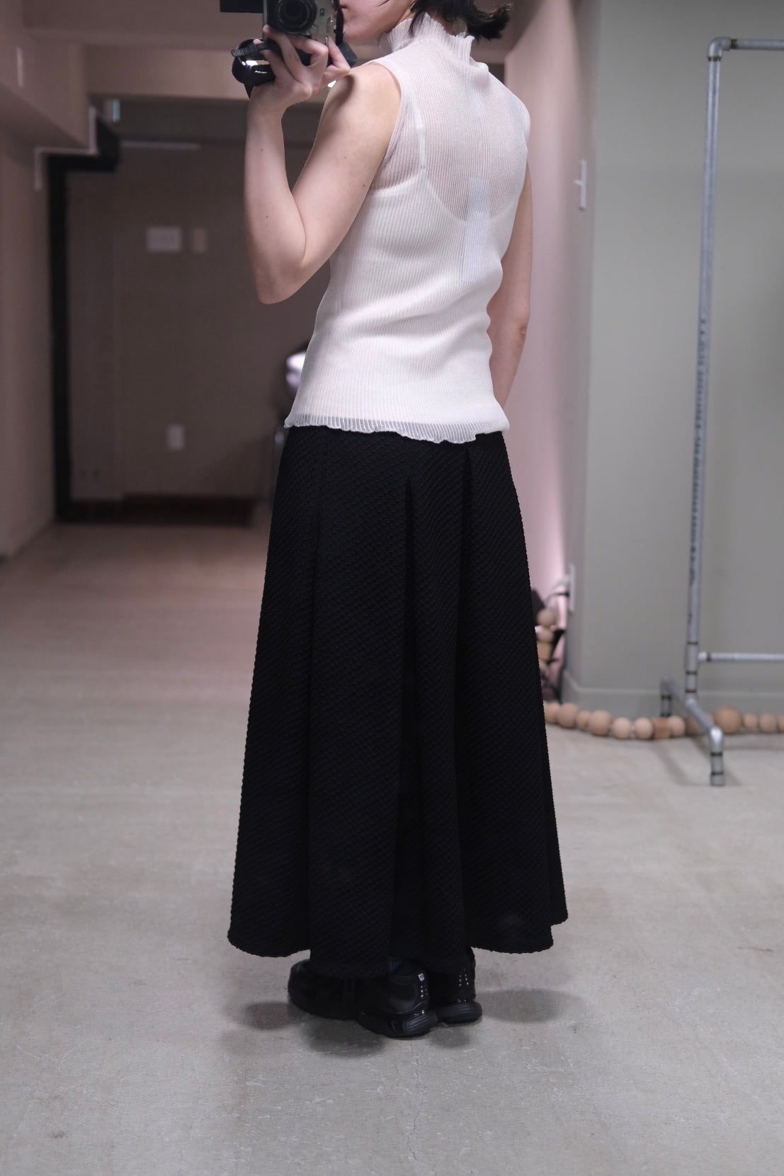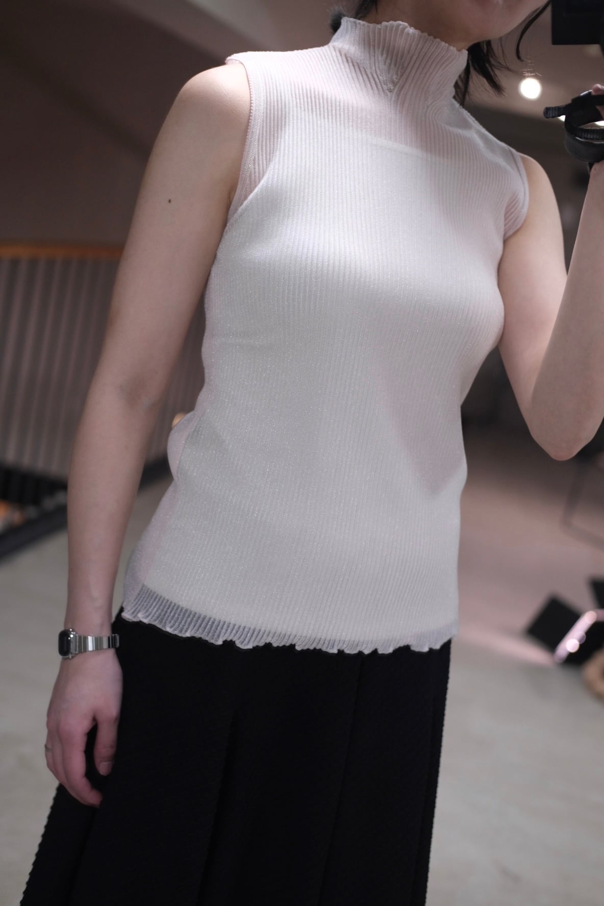 着用モデル:156cm 《size》 ⚫︎F 肩幅:29 身幅:28 着丈:55 《material》 ポリエステル 66% (内、56%再生ポリエステルを使用) ナイロン 34% 《color》 EGGSHELL PINK-OPAL