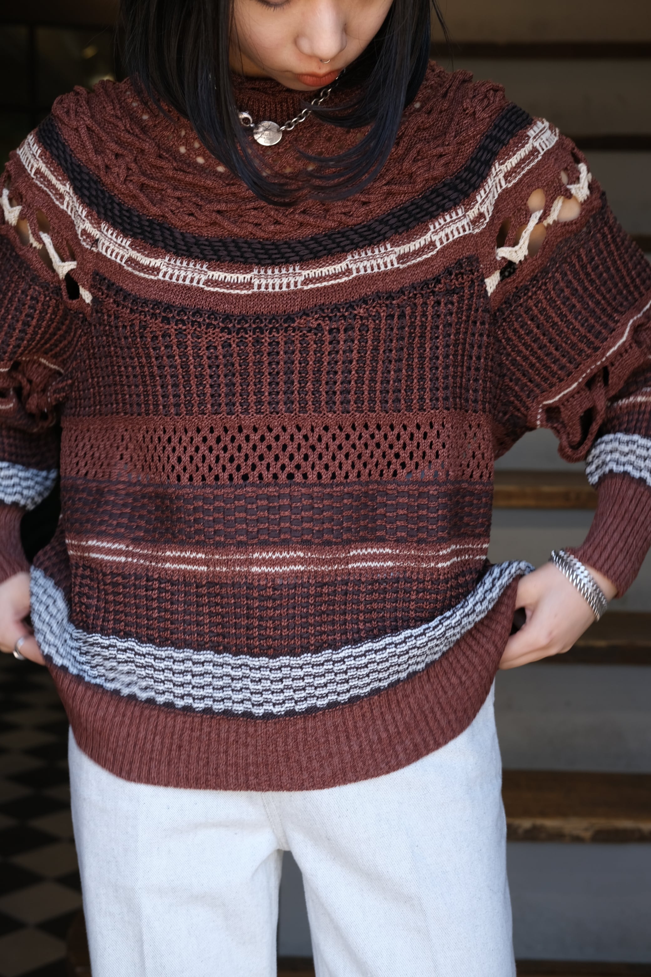 【Mame Kurogouchi】Bamboo Basket Pattern Knitted Top - brown